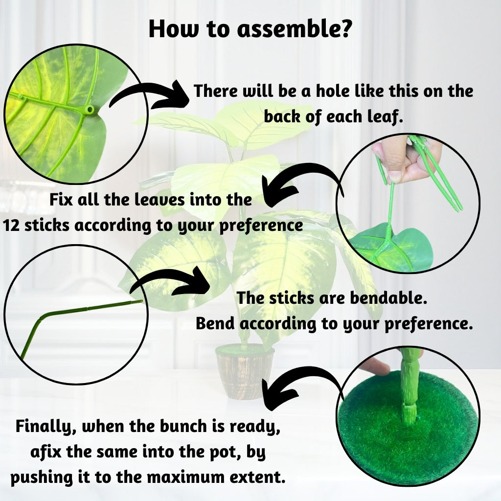 Each set includes a stylish pot and a bundle of 12 Green Leaves for Interior Decor with adjustable height, providing versatility in placement.