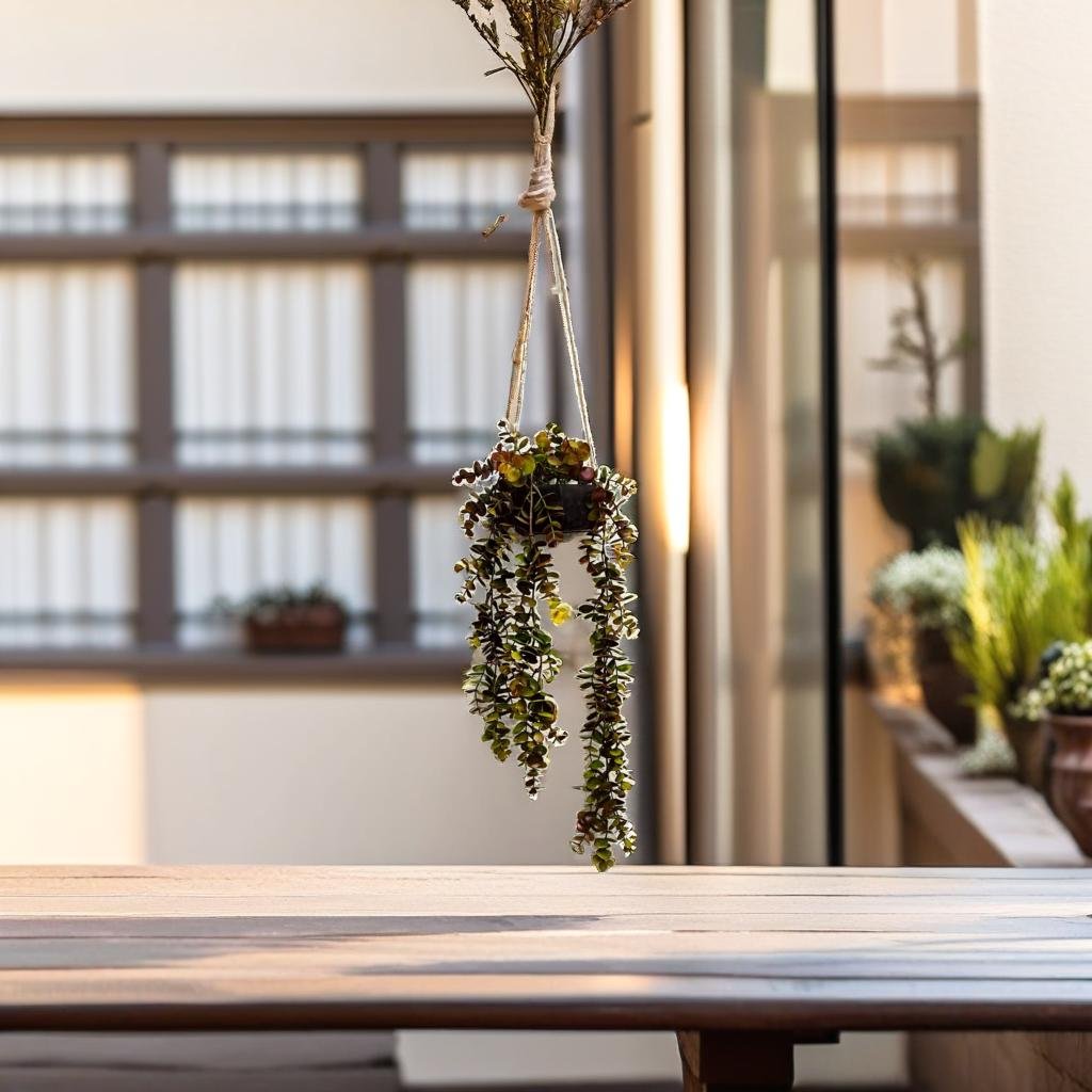 With a durable hanging string, it can be suspended from hooks, ceiling mounts, or curtain rods for easy decoration. At 25 inches in total length, including the pot and hanging string, it offers ample coverage, suitable for small and large spaces alike. Requiring minimal upkeep, it's perfect for busy individuals or those without a green thumb.