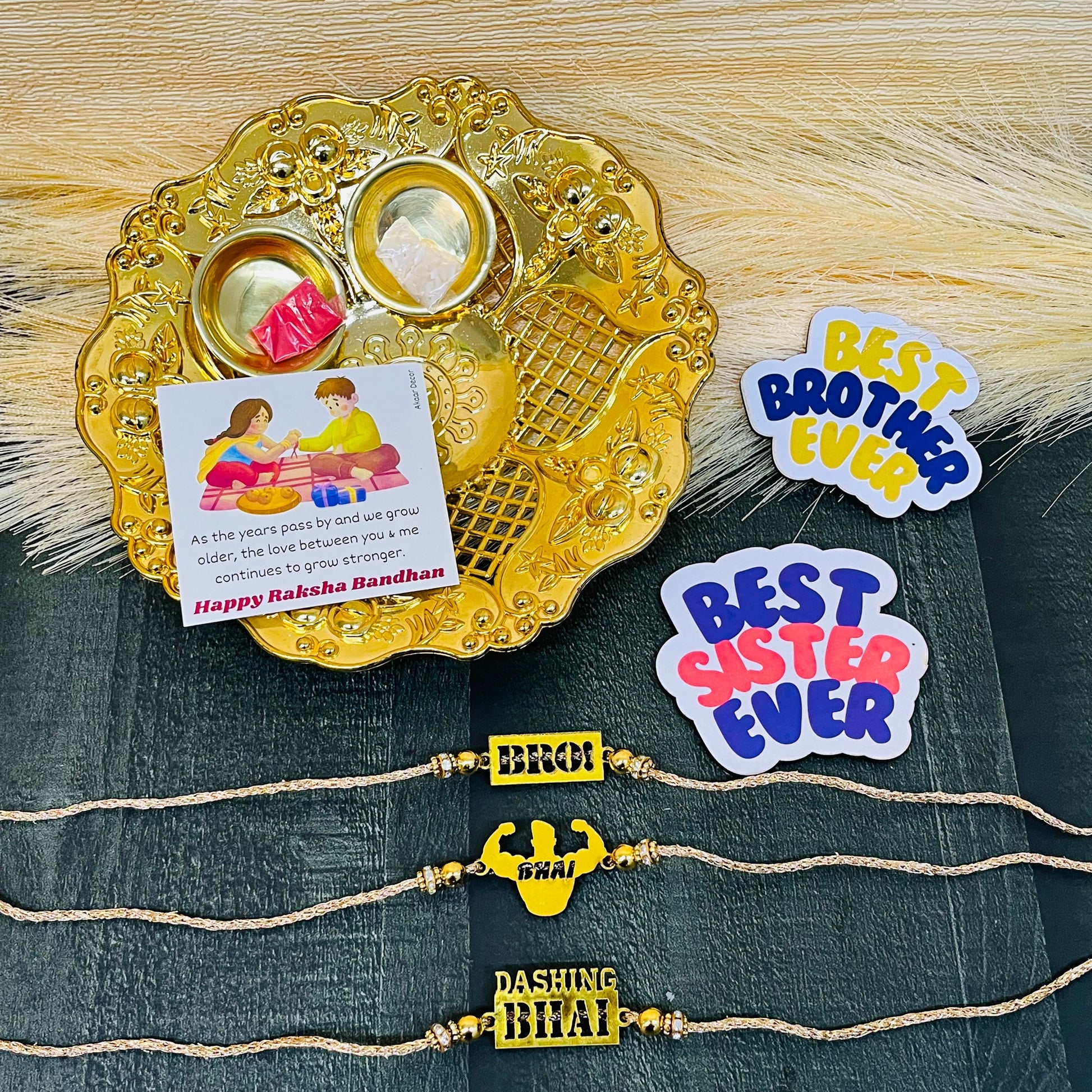This includes a stunning Rakhi Plate. The set features three unique rakhi.